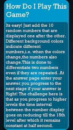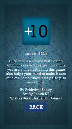 SUM TEN PRO is a simple number game where u have to add ten random numbers that appear one after another with a specific time delay between two numbers,then enter the answer and move to the next stage where the time delay decreases.