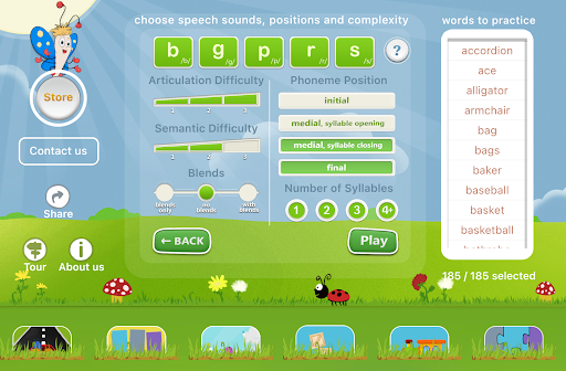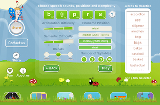 You can add or remove blends, increase or reduce semantic level, number of syllables and phonetic difficulty. You can practice a whole group of sounds by selecting several target sounds that share a phonetic category or address a type of error.