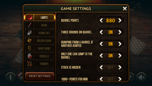 The game continues until one of the players scores 880 points. After the player scores 880 points, he sits on the barrel. Sitting on the barrel, the player stops gaining points without winning the bid. In order for the player sitting on the barrel to win the game, he must win the auction and collect the required number of points - 120 or more. If the player, being on the barrel, does not collect the required number of points, he rolls off the barrel. A penalty may be provided for a certain number of rolls off the barrel. If another player climbs onto the "barrel", then the one sitting on the barrel is rolls off it with a penalty of 120 points. If several players hit the barrel at the same time, then they all roll off with a penalty of 120 points.