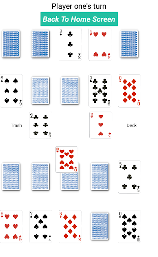 The next player will begin their turn by drawing either the top card of the deck pile or the top card of the “trash” pile (the card discarded by the previous player). The player will then place their card face up in the correct location in their layout, if available, displacing the card that was there to its own location, and continue until they find an unplayable card, which they add to the top of the discard pile to end their turn.