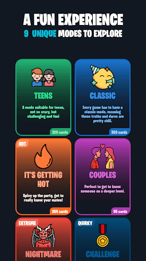 TEENS Mode: 🚀 Dive into fun with a perfect blend of challenges and truths! Ideal for parties and hangouts, delivering excitement with the right touch of mischief.