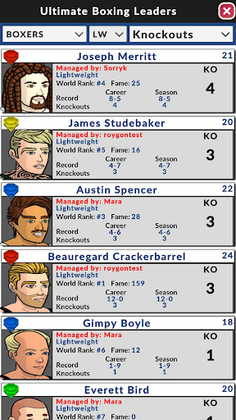 Your boxers will age, evolve and retire. They will compete for titles, enter tournaments and gain fame and fortune as you compete in an ever changing boxing simulation!