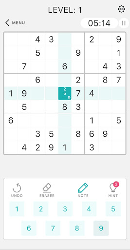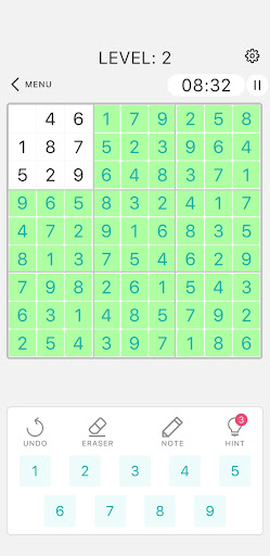 The game consists of 9 3x3 grids. Numbers 1 to 9 according to the specified difficulty level must be filled in such a way that they do not repeat in each grid and the outermost large grid. You will get 3 hints at each new level. You can add more than one number to the selected box with the note button in the game. You can clear your processes with the back, delete or restart buttons.