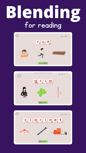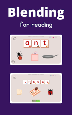 Blending is the skill used for reading. Kids learn to blend the individual sounds of a word to read. The number of words available for blending practice grows as more letter sounds are introduced.