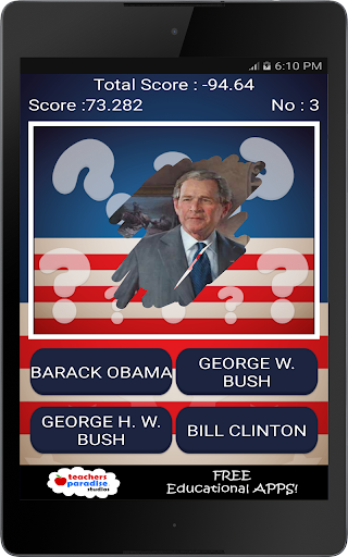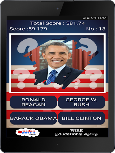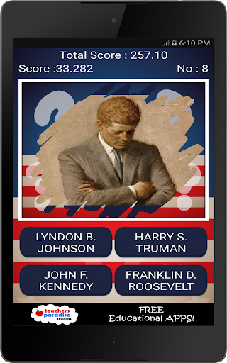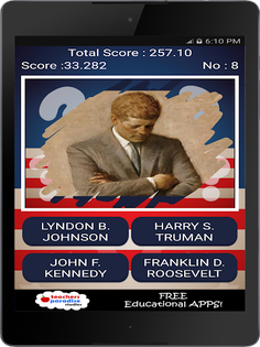 The game features multiple US Presidents quizzes. Short quizzes to keep the entire family learning about US Presidential history.