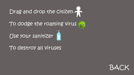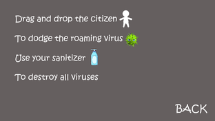 Drag and drop the citizens to dodge oncoming virus. Use your sanitizer to destroy multiple virus present. Survive as long as you can.
