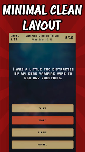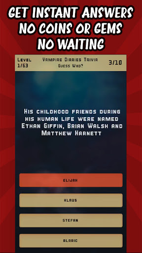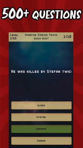 The Vampire Diaries trivia quiz contains questions about the vampire diaries characters, quotes and episodes of the TV show. From Stefan and Elena to Klaus and Caroline, this quiz game will challenge your memory and put your 'Vampire Diaries' expertise to the test. With multiple choice questions and a variety of difficulty levels, this game is perfect for fans of all ages and levels of familiarity with the show. So why not gather your friends and see who among you is the ultimate 'Vampire Diaries' trivia master.