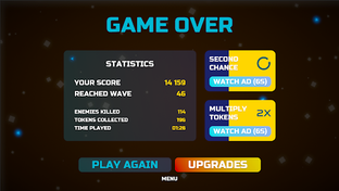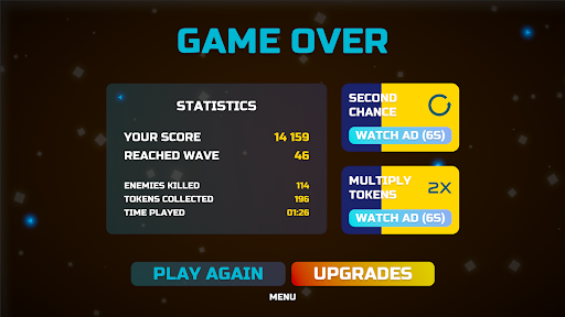 Luckily, you have a fighting chance by upgrading your ship and keeping an eye out for yellow tokens that enemies drop. These tokens can be used to purchase vital upgrades that will help you climb higher waves and rack up an even higher score.
