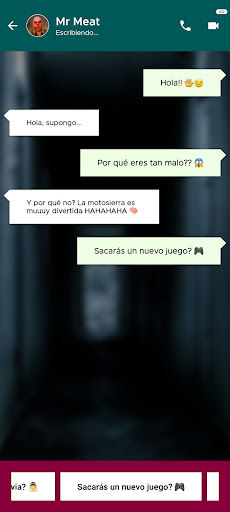 Con esta aplicación podrás simular un chat falso con Mr Meat para gastar una broma a tus amigos y hacerles creer que tienes contacto con el carnicero terrorífico Mr Meat!