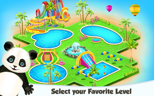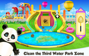 Move to the further sections and clean the pools that are differently shaped. Maybe you will meet other challenges like removing the leaves or replacing the unfunctional pipe. Either way, you should use the tools we've provided. Follow the instructions and you will encounter no problem with the cleaning. After each stage, you will let the panda bear get a ride and have fun with the newest toys and waterslides this park has to offer. Try to have as much fun as he is having on this watery day.