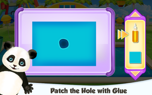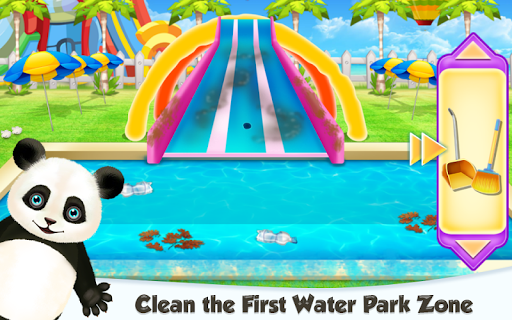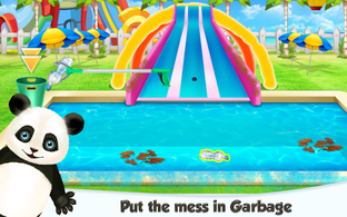 You will be using interesting tools and besides the chores that will be assigned to you, there will be a part in which you will let the panda slide and splash in the new and cleaned pool space. Try to use your skills if you have any, but if you don't, there will be plenty of time and opportunities to get to know the procedures. First, you will be cleaning the space, then you will be having the playing time with the panda. Begin with the square shaped pool and find what challenges are waiting for you in there. Seems like there are some like cleaning the garbage that is in the water, making the margin clean and water free, swelling the slide part that needs reconstruction and repairing the hole that is in it.
