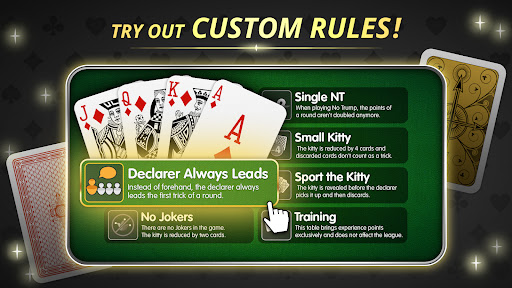 - Discover custom rules: Declarer Always Leads, Small Kitty, No Jokers, etc.