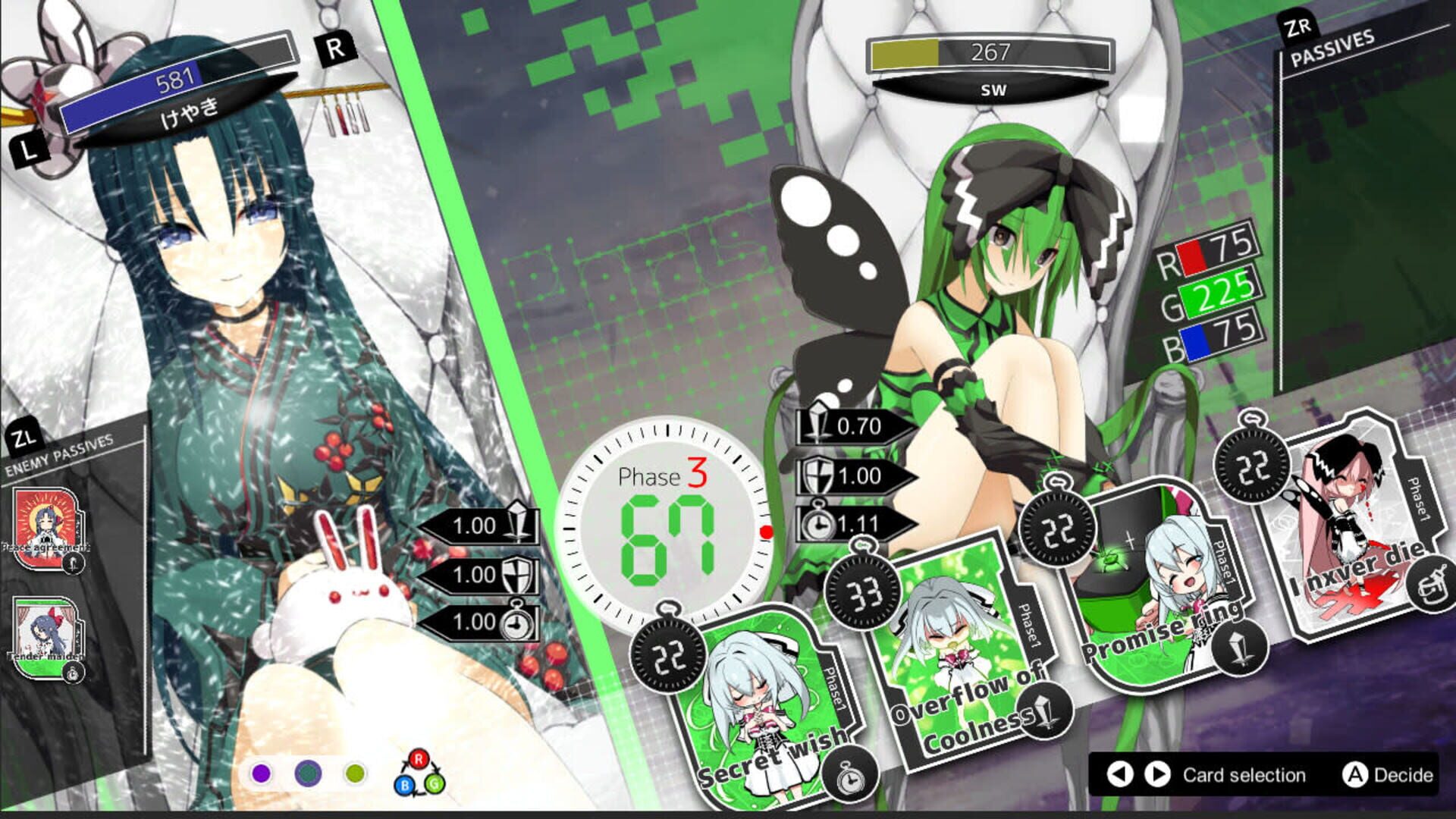 Update your AI girl using “Pieces of Memory”- cards which let you update your girl’s features or attack your opponent's characters. The more you update your girl, the more her body gains unique colors that express three different values - R, G, and B. This not only influences the girl’s appearance but also her status.