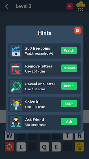 ★ Game Hints (Remove wrong letters, Reveal a letter, Solve puzzle).