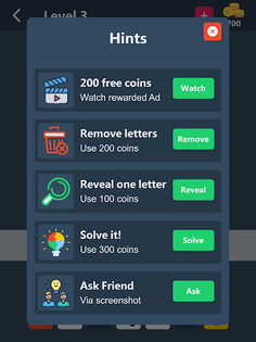 You can get coins by watching rewarded videos that you can use to get hints and solve these mini word riddles.