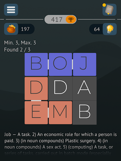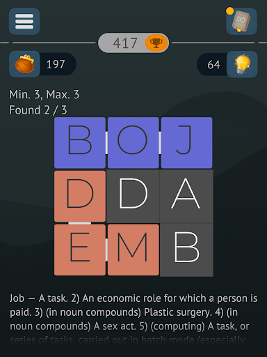 At the beginning of the game, you'll see a small playing field where you need to find simple three-letter words. You can place the words in any direction except diagonally by swiping your finger across the squares on the board. You'll quickly get the hang of it! As you progress, the game becomes increasingly difficult, and subsequent levels are no longer so easy. The objective of each level is to locate all the words that have been hidden on the field. If you happen to find a word on the board that was not included in the puzzle, you earn game coins! You can exchange these coins for hints to assist you in tough situations.