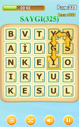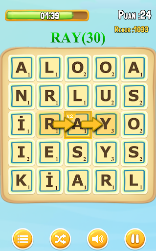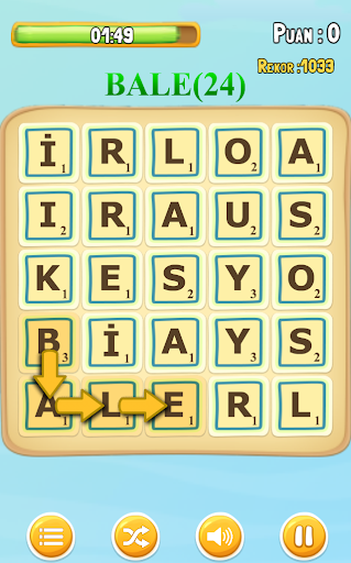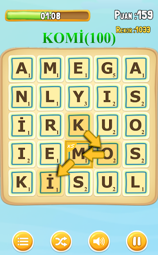 The aim is to create meaningful words from mixed letters. You should swipe your finger across the letters and create a valid word. If you find a valid one, used letters disappear and new letters will come. You have 2 minutes, but you gain extra seconds by creating long words.