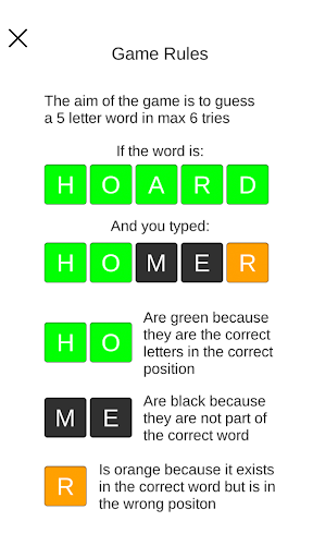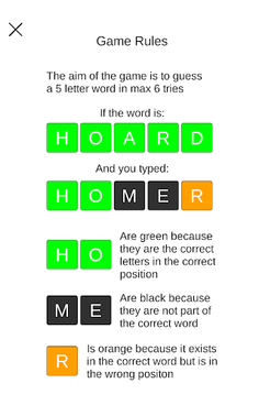 letters get colored according to usability and placements, green means the letters are correct and in the correct position, orange means the letters are correct but in the wrong position, and black means letters are not part of the hidden word