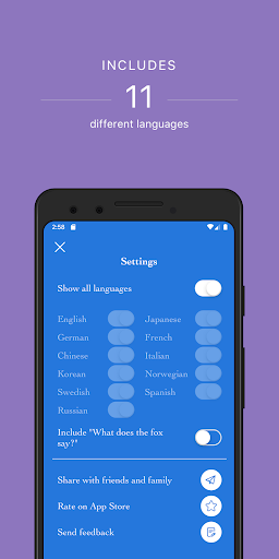 WorldAnimals is originally inspired by the creator's experience of studying the Japanese language while living in Japan for a year. One of the best experiences was learning Japanese animal onomatopoeia, and the instructor asking classmates from different countries what the animals sounded like in their languages. The maker of WorldAnimals currently speaks English, Chinese, and Japanese with plans to learn more in the future; other languages were researched to make this app.