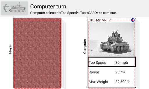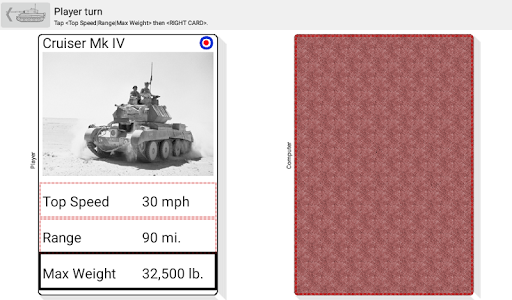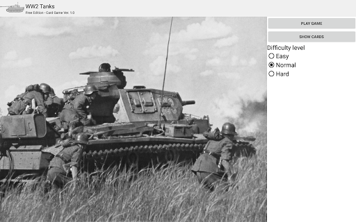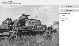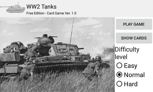 The app's "Play Game" mode allows playing a classic "higher stat beats the other" card game against a computer player in three difficulty settings. The tank cards display WW2 vintage photos and the stats Top Speed, Range and Max Weight. The "Show Cards" mode provides a brief introduction to the various tanks.