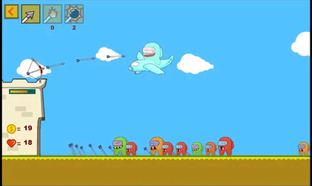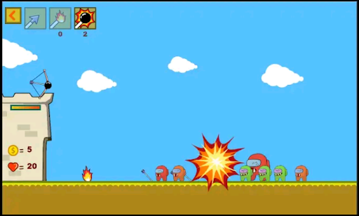 To kill the zombies, hit several times with bow, fire and bomb. Use coins to upgrade weapons.