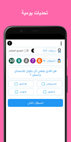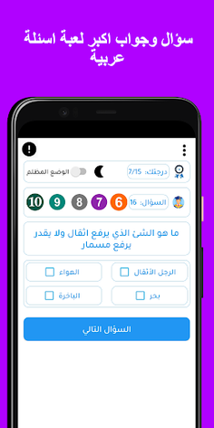 تطبيق مسابقة لعبة الاسئلة - سؤال وجواب هو تطبيق معرفي تعليمي تضم سؤال وجواب صعب و سؤال وجواب سهله ويظم أكتر من 2000 سؤال وجواب متنوع في مجالات عدة منها يظم تطبيق سؤال وجواب - لعبة الاسئلة مستويات عدة اكثر من 20 مستوى سؤال وجواب في مجالات مختلفة من الدينية والجغرافية والمعرفية والرياضية والطبية وأغلب المجالات المعروفة.