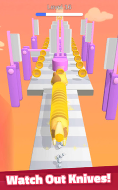 Just control it to jump, run, grow, avoid obstacles, pick up more gold coins and food on the dangerous track,