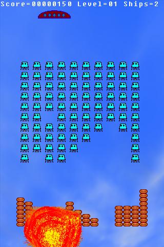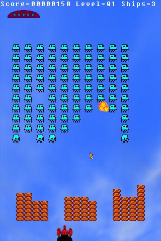 Each level is harder than the previous: aliens shall be more and more aggressive, more enemy missiles shall be fired, and the energy barriers shall be thinner.