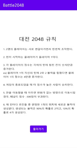 판을 스와이프해서 블럭을 합쳐 더 높은 점수를 얻고자 하는 2048 게임을 2명의 플레이어가 1대1 대전 형식으로 진행하는 게임입니다.