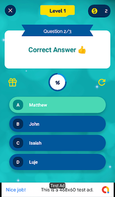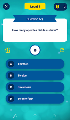 It lets you have fun while answering exciting questions from the Bible. It features an immersive, intuitive and aesthetic interface that you'd love to navigate through. The first time you launch the app, you are asked to enter a username and choose an avatar from a list of delightful avatars, to represent your persona in the game. You can always change it in the User Profile if it no longer suits how you want to be represented in the game. The app has multiple levels to indicate your current progress. Each level has three questions. You only progress to the next level when you answer all three questions correctly. You earn coins if you answer a question correctly and more coins when it is answered in time. You can see the general progress of everyone playing the game from the app's leaderboard. You get rewarded with a gift box of coins from time to time as you progress. You can stop the game at anytime to do a chore or attend to a matter and then resume later from where you left off.