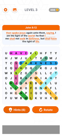 Find words on board & connect letters to solve tons of bible verse puzzle levels. Memorizing bible verses has never been easier or more relaxing.