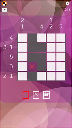 To solve a puzzle, one needs to determine which cells will be boxes and which will be empty. Solvers often use a dot or a cross to mark cells they are certain are spaces. Cells that can be determined by logic should be filled. If guessing is used, a single error can spread over the entire field and completely ruin the solution. An error sometimes comes to the surface only after a while, when it is very difficult to correct the puzzle. The hidden picture plays little or no part in the solving process, as it may mislead. The picture may help find and eliminate an error.