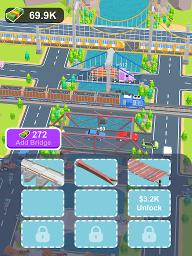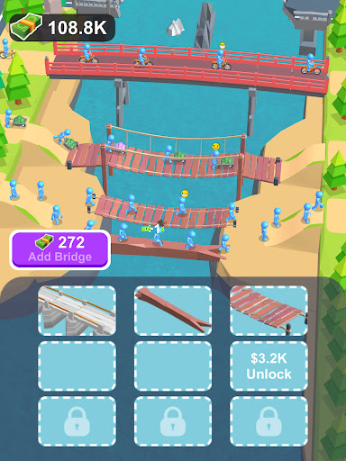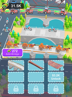 As people and vehicles cross your bridges, they generate income for you. The higher the level of the bridge, the greater the earnings from the passing traffic. Use your earnings to purchase additional low-level bridges and continue merging them to unlock more advanced structures.