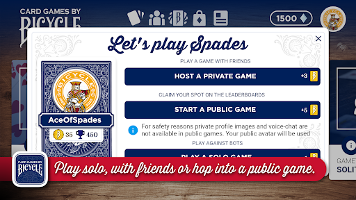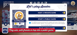 You can compete in Public Ranked Lobbies, play with friends using voice chat in Private Lobbies, or practice against bots. Whether it's a quick game of solitaire to relax or an epic game night playing Spades with your friends, we've got you covered!