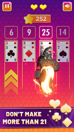The game has four columns where the player needs to place the cards in order to make 21 points. That is why its name is 'Cards 21'. You get three lives in the game to make as much score as you can. However, you can use a maximum of 5 cards only in order to make a 21 score otherwise you will lose a life. You can also lose if the grand total of the cards becomes more than 21. If the player wins or loses, in both cases, the column will be cleared automatically.