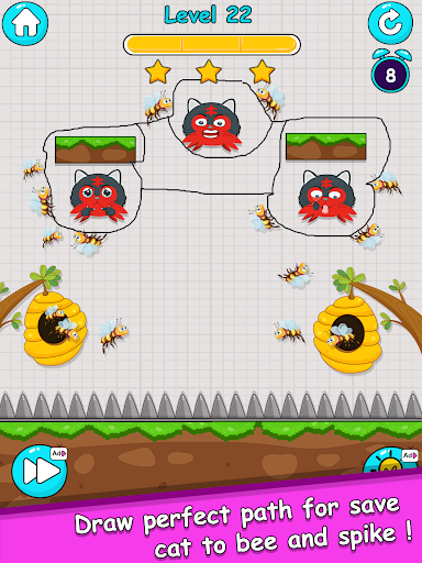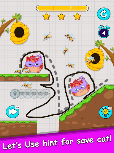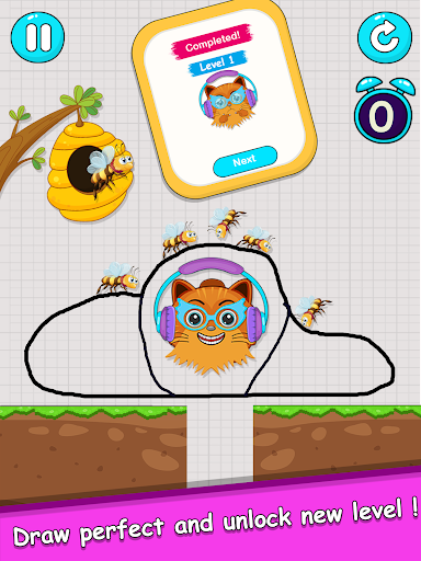 Save the cat: Draw To Save is a draw save puzzle games. You draw one line with your fingers to create walls that protect the cat from attacks by bees in the hive. You need to draw to save the cat with the painted wall for 12 seconds during the attack of the bees, hold on and you will win the game. Use your brain to save the cat.