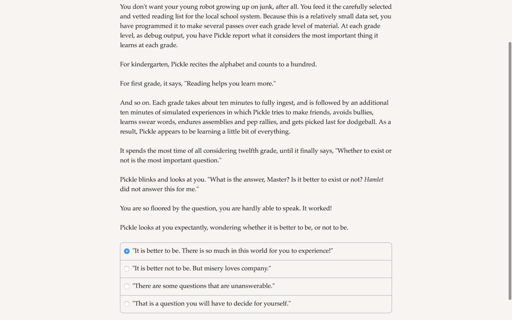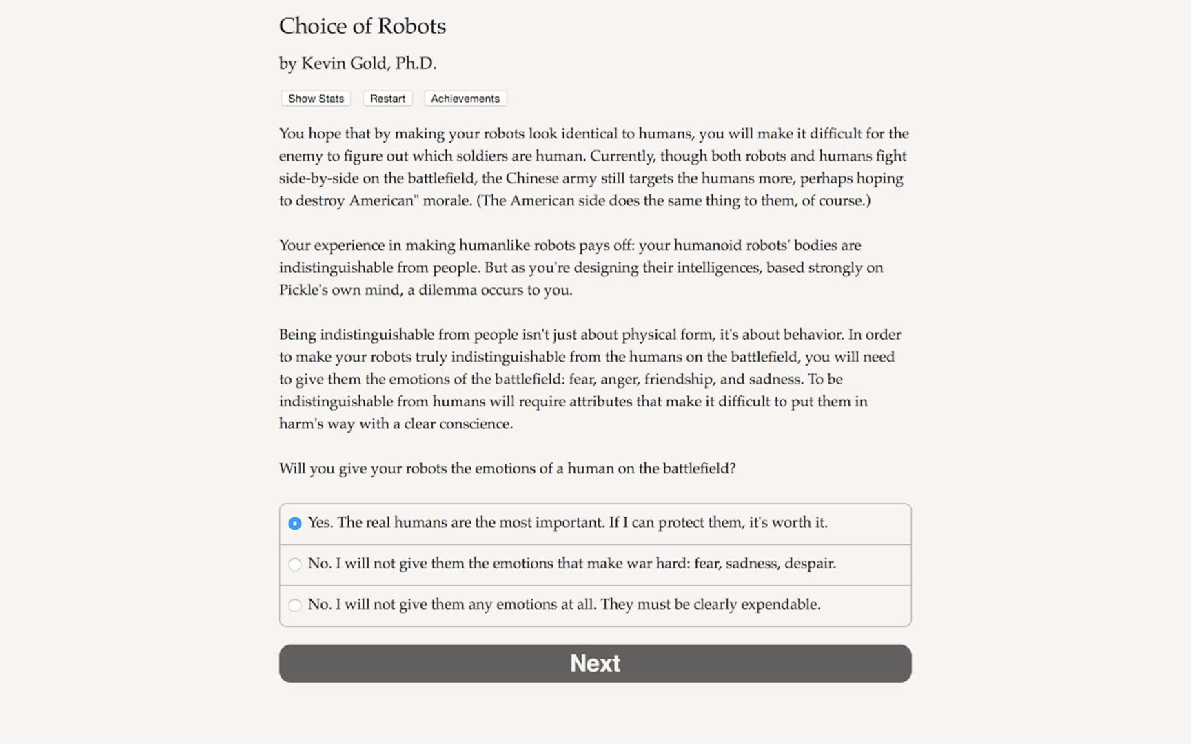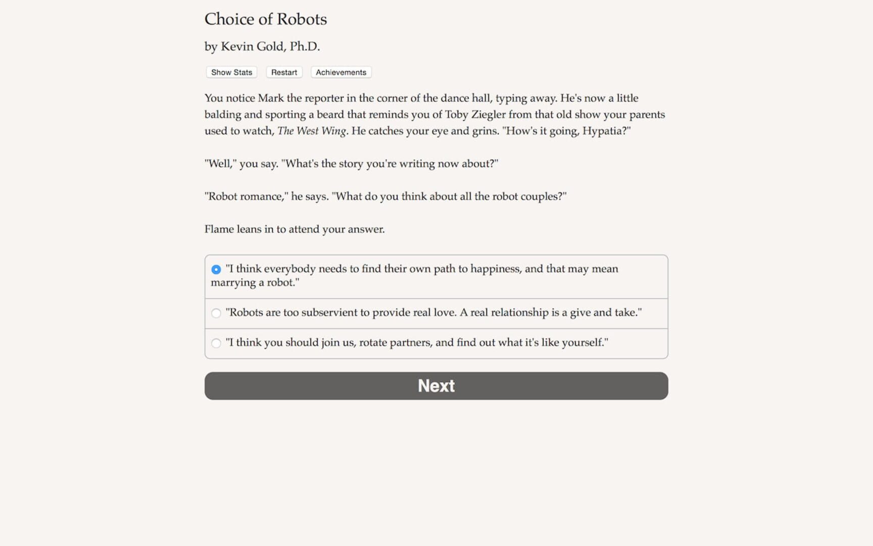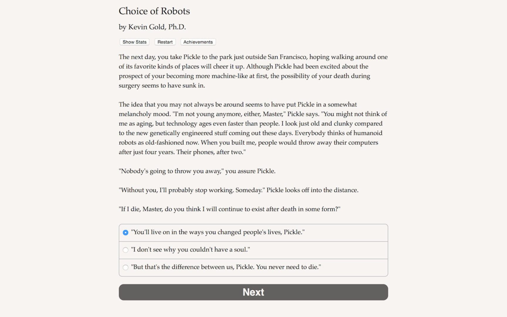 Choice of Robots" is an interactive science-fiction novel by Kevin Gold where players can experience a life of thirty years as a robot creator. This epic 300,000-word story gives you the liberty to determine your fate with thirty years of choices that can lead your path to a brilliant future where your robots are game-changers.