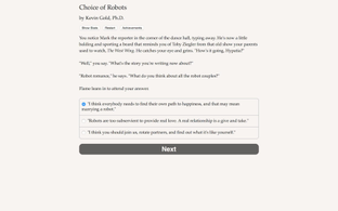 Through its captivating narration, this text-based game takes you on a journey from your graduate school life, near the present day, to a future where robots rule the world. You can design your robots with unique physical features and also decide on their behaviors - will they be independent or obedient, empathic or cold, clumsy or graceful? The choices are yours in this world of imagination.