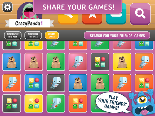 Our secure community is an “app store” for games built by kids. Here you can share games, collect hearts and save your favorite games. You can also get inspired for your next creation by playing other friend’s games.