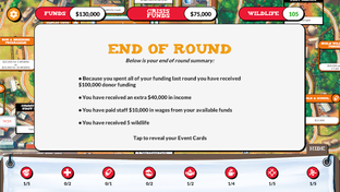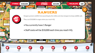 Make sure that you keep some money aside in your Crisis Fund to respond to emergencies within the game. If you lose funding, you’ll have to make up the loss from your Crisis Fund, and if the poachers cause problems you’ll need extra funds to fix your projects and pay staff to keep them at their posts.