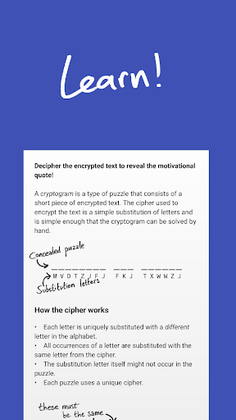 A cryptogram is a word puzzle that consists of a short piece of encrypted text. The cipher used to encrypt the text is a simple substitution of letters and is simple enough that the cryptogram can be solved by hand.