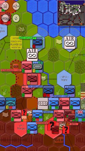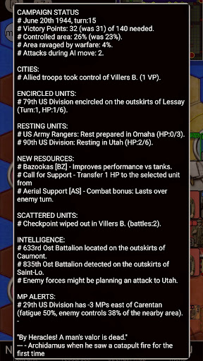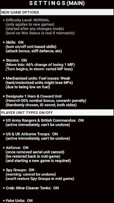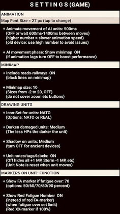 + Settings: Various options are available to alter the look of the gaming experience: Change difficulty level, hexagon size, Animation speed, choose icon set for units (NATO or REAL) and cities (Round, Shield, Square, block of houses), decide what is drawn on the map, and much more.