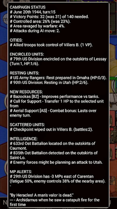 General Eisenhower has stepped down, and you are in command of the Allied invasion force (tank, airborne, infantry, and air force units). The object of the game is to break out of the D-Day beachheads and liberate as much of German-occupied France as possible, as quickly as possible. To have a chance to seize the top spot in the Hall of Fame, you need to skillfully encircle German units commanded by Erwin Rommel while battling both the regular Wehrmacht divisions and the feared Panzer VI (Tiger I) tank units.