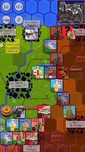 This game offers a nice, quick, small-scale map experience of the classic boardgame D-Day invasion at divisional level, which keeps the number of units reduced enough to allow turns to pass quickly, so you'll get your score into the Hall of Fame faster. A separate "Utah and Omaha" game models the American landings at the detailed battalion level, and the "Juno and Sword" game simulates the British-Canadian beachheads at the battalion level with a much larger map.