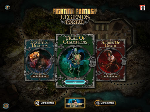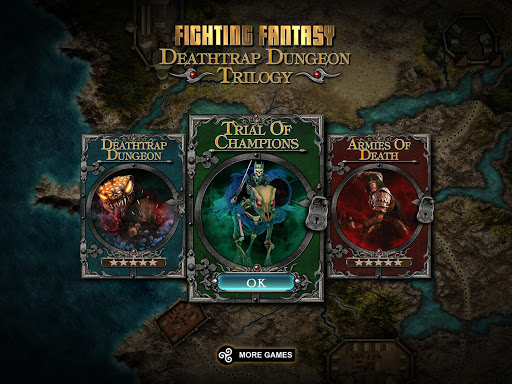 Play through three classic Fighting Fantasy gamebooks by author Ian Livingstone - Deathtrap Dungeon, Trial of Champions and Armies of Death.