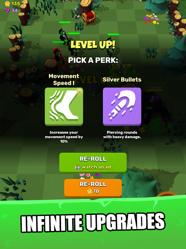 Upgrade your weapons and character with over 50 unique upgrades. Unlock countless weapons, each with unique upgrades and abilities. From the piercing beam of a laser gun to the explosive power of a goblin grenade, every weapon is a tool for survival. Special items are available to boost your skills, from a plant that heals to a cookie that boosts your energy.