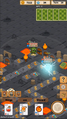 Players roll dice, explore the board, acquire cards, merge them, and strategically use them to defeat monsters. There are dozens of different monsters and over 100 stages. There are also dozens of characters available for players to collect, develop, and utilize.