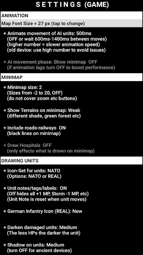 + Settings: Various options are available to alter the look of the gaming experience: Change difficulty level, hexagon size, Animation speed, choose icon set for units (NATO or REAL) and cities (Round, Shield, Square, block of houses), decide what is drawn on the map, and much more.