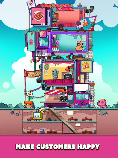 As the owner of the pizza joint, you'll need to supply all the areas properly so you can serve the funny creatures that come to your building to eat pizza, waffles, milkshakes, and even burgers. With each new floor you build, you'll have the opportunity to offer more ingredients and a huge variety of delicious food that will keep your clients coming back for more.