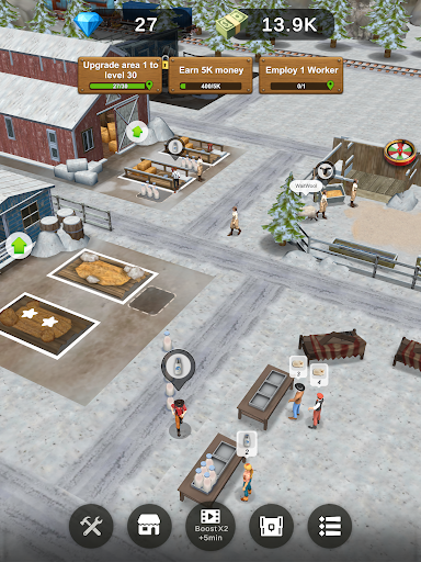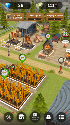 The game starts with the first world, where players build a farm from scratch: unlock cow sheds first, feed cows to get fresh milk or slaughter them for beef; meanwhile, unlock farmland to grow wheat, which can be used as feed to raise chickens for eggs or processed into raw materials for wine brewing.